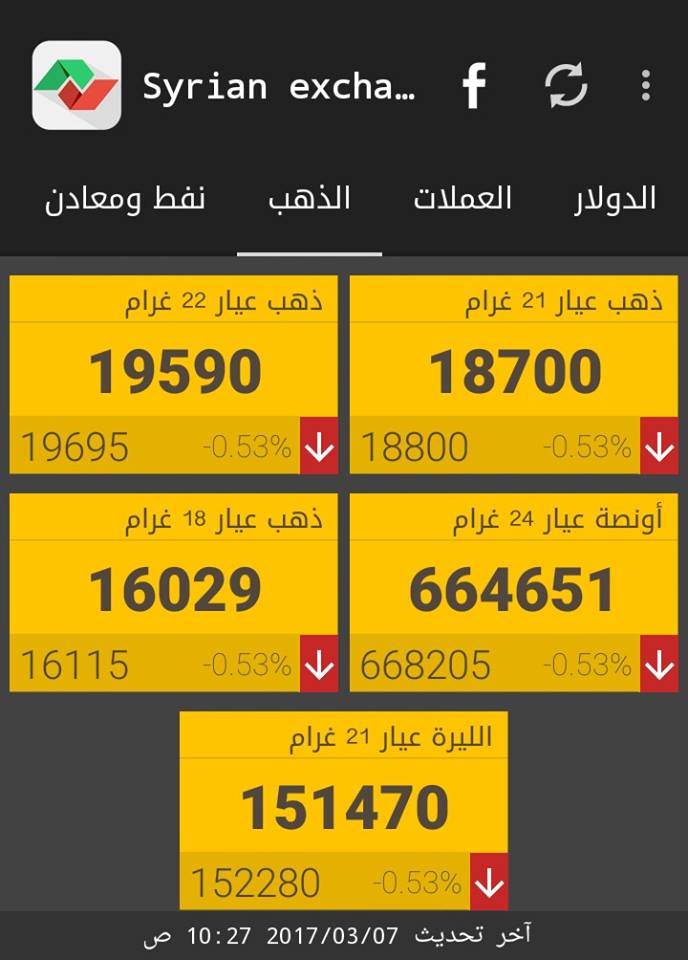 وفيما يلي أسعار أوزان الذهب حسب "سيرياستوكس":