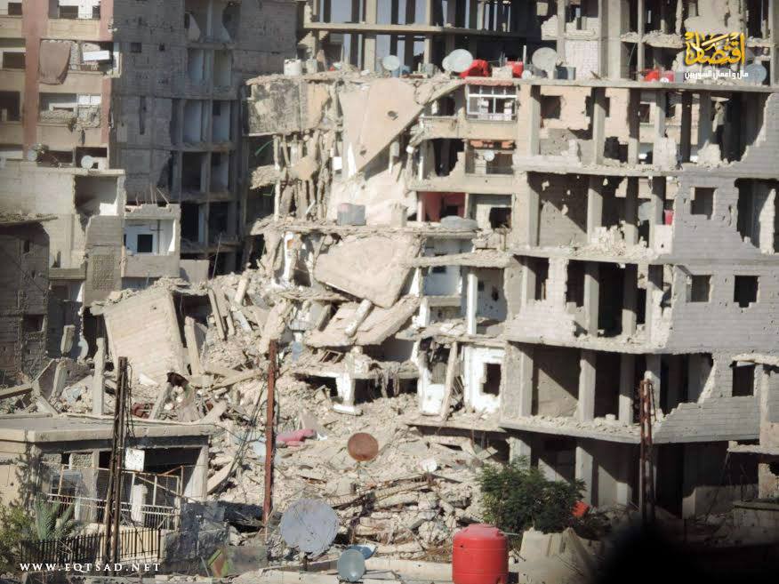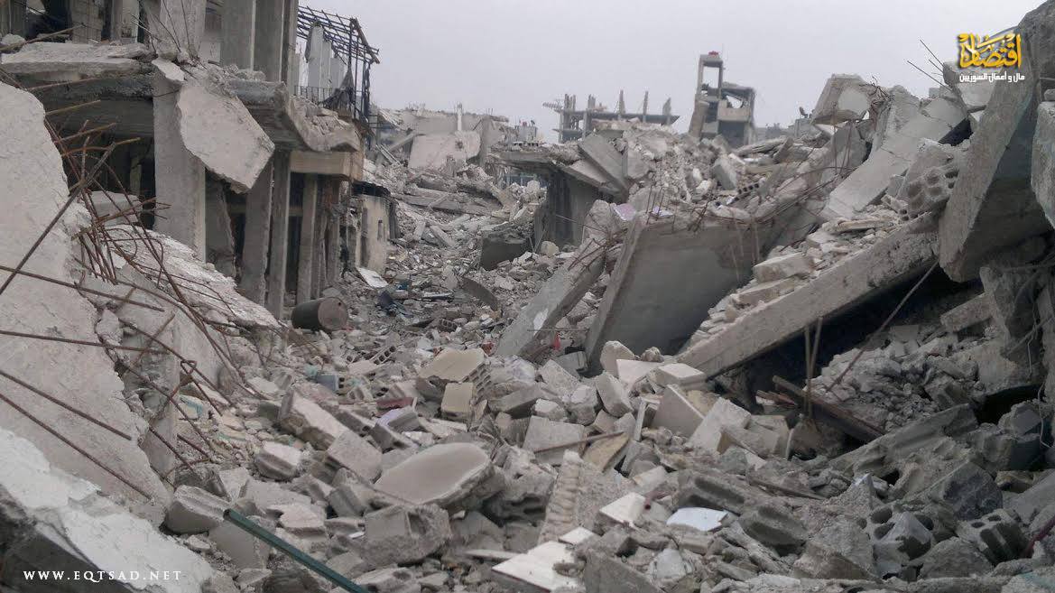 على امتداد شارع دعبول بمنطقة سليخة لا يمكن أن ترى بناء واحداً قائماً. الشارع يعتبر الخط الفاصل بين منطقة سيطرة النظام والجزء الذي يسيطر عليه الثوار وتنظيم الدولة من حي التضامن.
