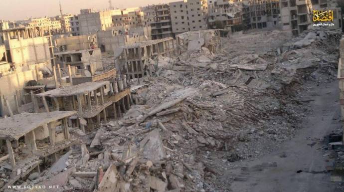 وقال "حذيفة" الذي صوّر الدمار الكبير في هذه المنطقة، "لا أحد يستطيع الاقتراب نحو الشارع بسبب قنصه من قبل قوات النظام المتواجدة في شارع نسرين والمناطق المحيطة".