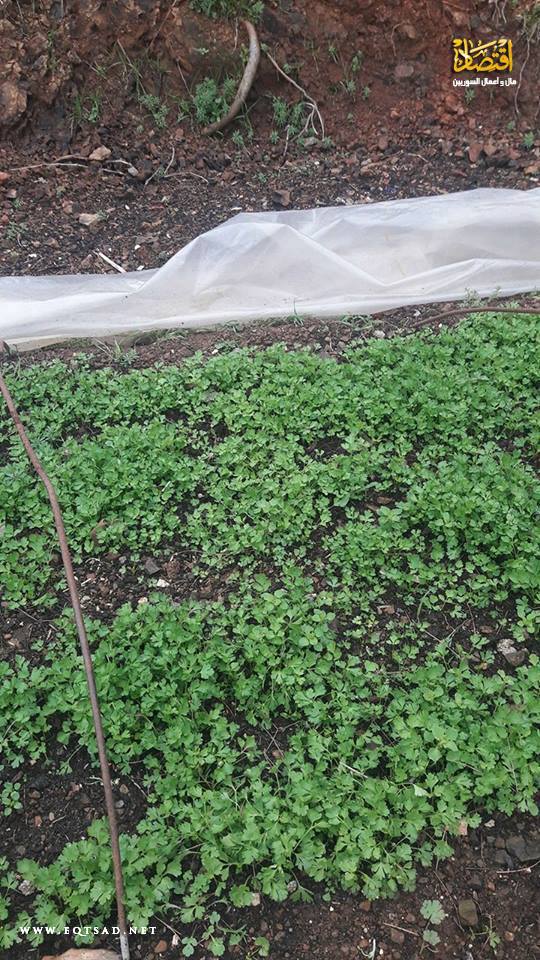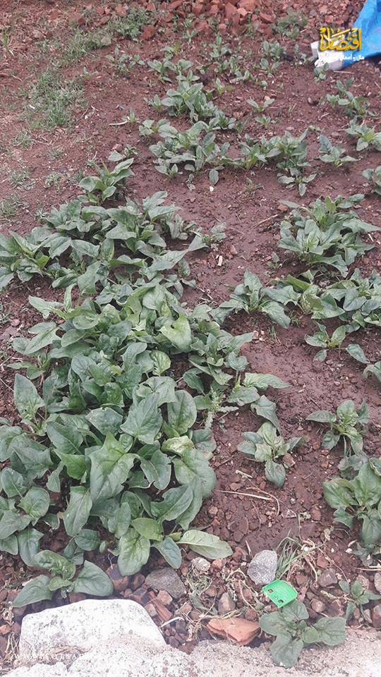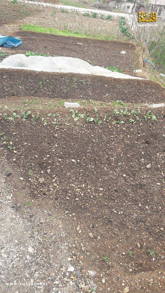 بادر أبو عدنان فوراً إلى تقسيم الأرض إلى مساطب بطول ثلاثة أمتار وعرض متر ونصف، وزرعها بعدة أنواع من الخضروات "بندورة وفليفلة وبصل وثوم وبقدونس ونعنع وجرجير وفجل ووو"، لأجل الاستهلاك المنزلي.