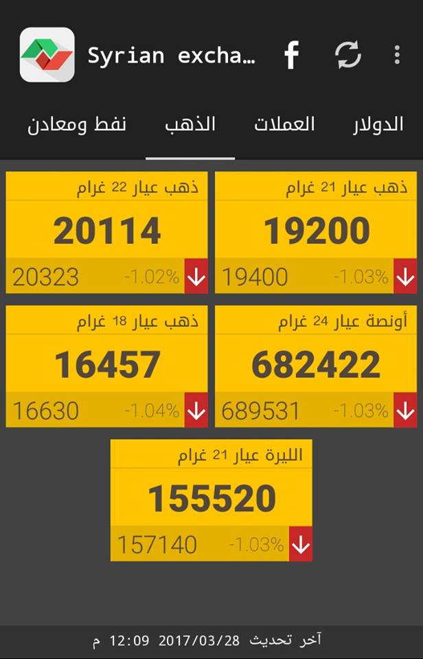وفيما يلي أسعار أوزان الذهب حسب "سيرياستوكس"، وفق التسعيرة الرسمية الصادرة عن جمعية الصاغة بدمشق: