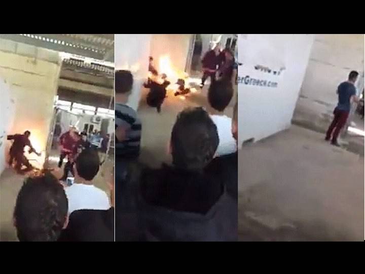 تناقلت عدد من المواقع وصفحات التواصل الاجتماعي، يوم أمس، "فيديو" لأحد اللاجئين السوريين في اليونان وهو يهدد من حوله عناصر الشرطة والموظفين بحرق نفسه أمام إحدى مراكز اللجوء في واحدة من الجزر اليونانية، ليقوم بعدها بإضرام النار في نفسه دون إيضاح تفاصيل أكثر عن ملابسات هذا الحادث، والسبب الذي دفعه للقيام بحرق نفسه بعد سكب مادة البنزين على جسمه من (غالون) كان يحمله بيده.