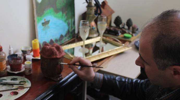 في بيت صغير على أطراف مدينة كليس التركية، ينهمك اللاجئ السوري محمد بوشناق (42 عاماً)، في إنتاج القطع الفنية والصمديات، منتهزاً وقت فراغه الضيق، بسبب عمله في الدهان والرسم على الجدران، وبسبب متابعته لشؤون أسرته وأولاده الخمسة.