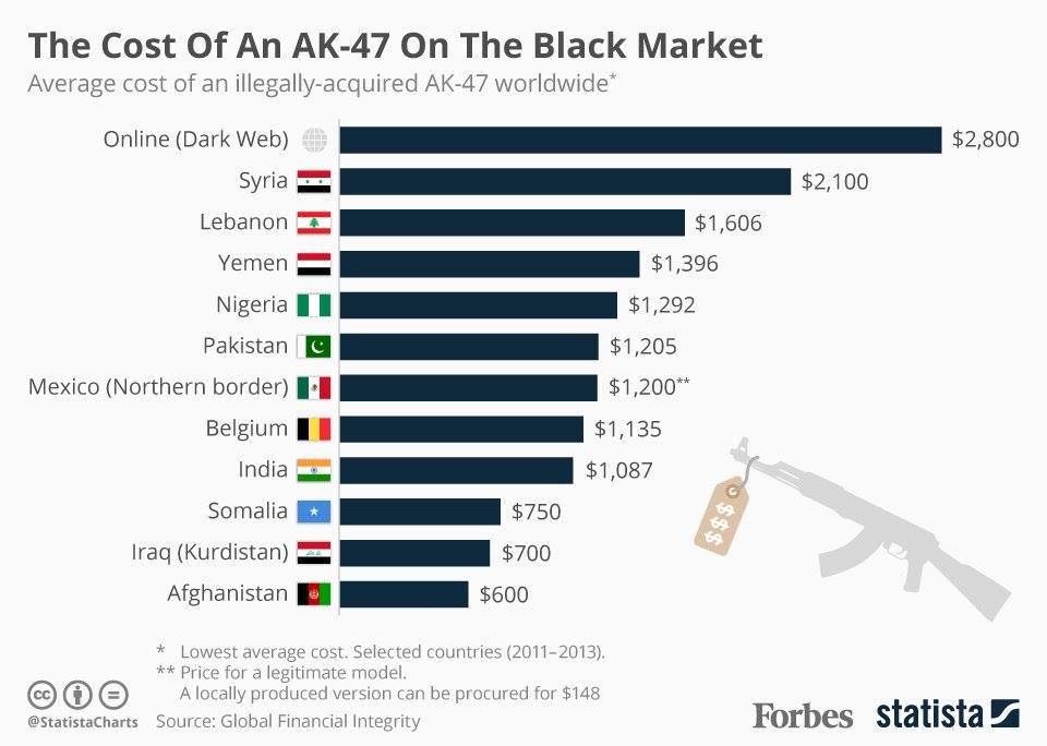 نشر موقع ( statista ) المختص بنشر الإحصاءات والدراسات قبل أيام، رسماً بيانياً يوضح أسعار البندقية الآلية AK -47 المعروفة بـ "الكلاشنكوف" في السوق السوداء التي تدار من قبل تجار السلاح في العالم.