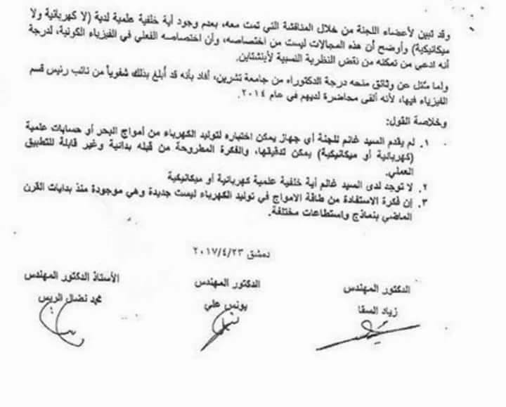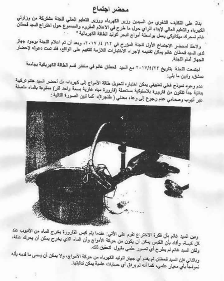 (النص التفصيلي لقرار لجنة وزارة الكهرباء المشكلة لاختبار فكرة قحطان غانم، والتي خلصت إلى أن فكرته بدائية وغير ذات جدوى)