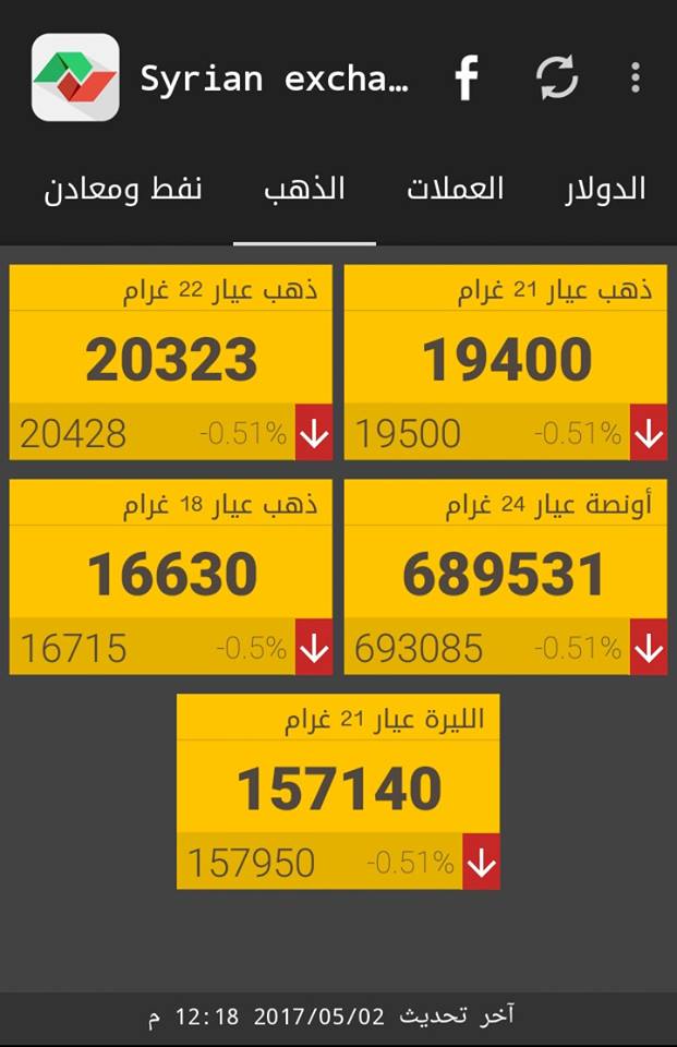 وفيما يلي أسعار أوزان الذهب حسب "سيرياستوكس"، وفق التسعيرة الرسمية الصادرة عن جمعية الصاغة بدمشق: