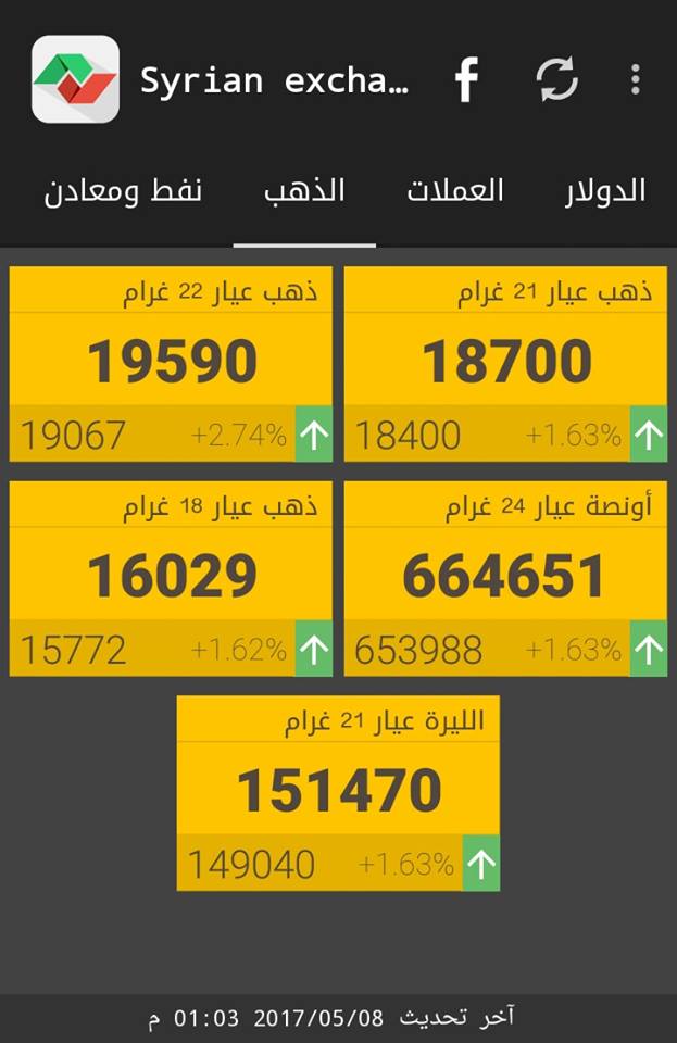 وفيما يلي أسعار أوزان الذهب حسب "سيرياستوكس"، وفق التسعيرة الرسمية الصادرة عن جمعية الصاغة بدمشق: