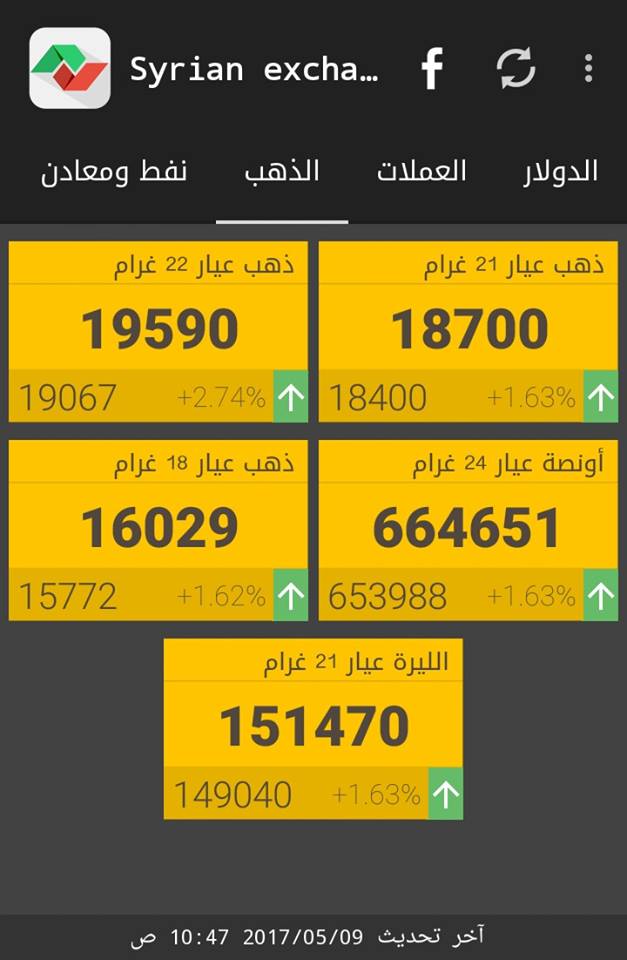 وفيما يلي أسعار أوزان الذهب حسب "سيرياستوكس"، وفق التسعيرة الرسمية الصادرة عن جمعية الصاغة بدمشق: