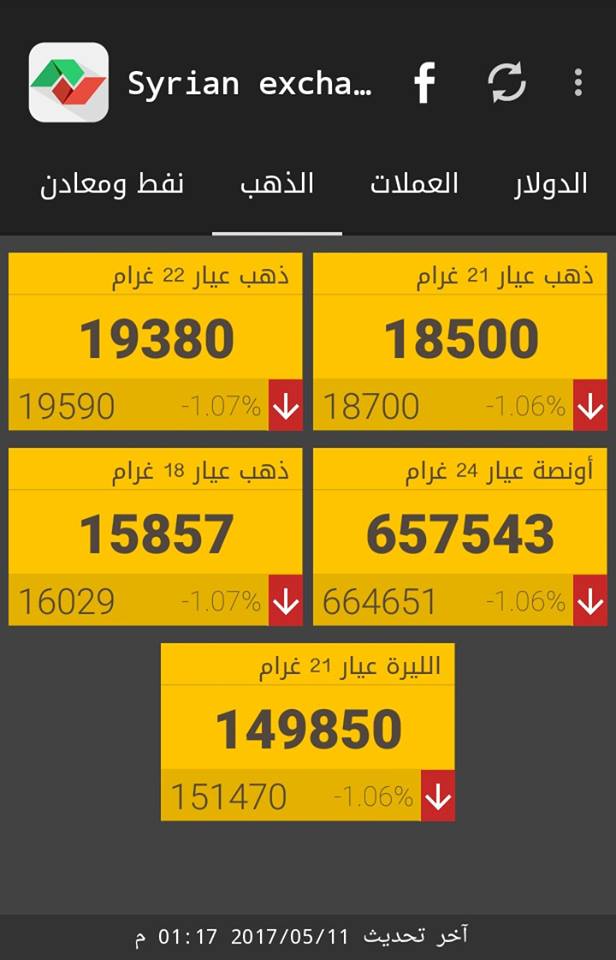 وفيما يلي أسعار أوزان الذهب حسب "سيرياستوكس"، ووفق التسعيرة الرسمية الصادرة عن جمعية الصاغة بدمشق: