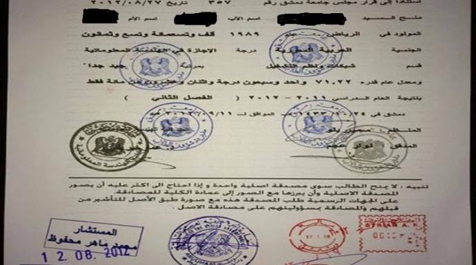 نقلت جريدة الوطن الموالية للنظام عن مدير شؤون الطلاب والامتحانات في جامعة دمشق، بشار ضو، أن وزارة تعليم النظام عممت على كل الجامعات السورية بهدف الاستفادة من تجربة جامعة دمشق الخاصة بتطبيق علامات أمنية ولصاقة لكشف عمليات التزوير أو الاحتيال والتلاعب الحاصل في مصدقات التخرج الجامعية والوثائق الطلابية.