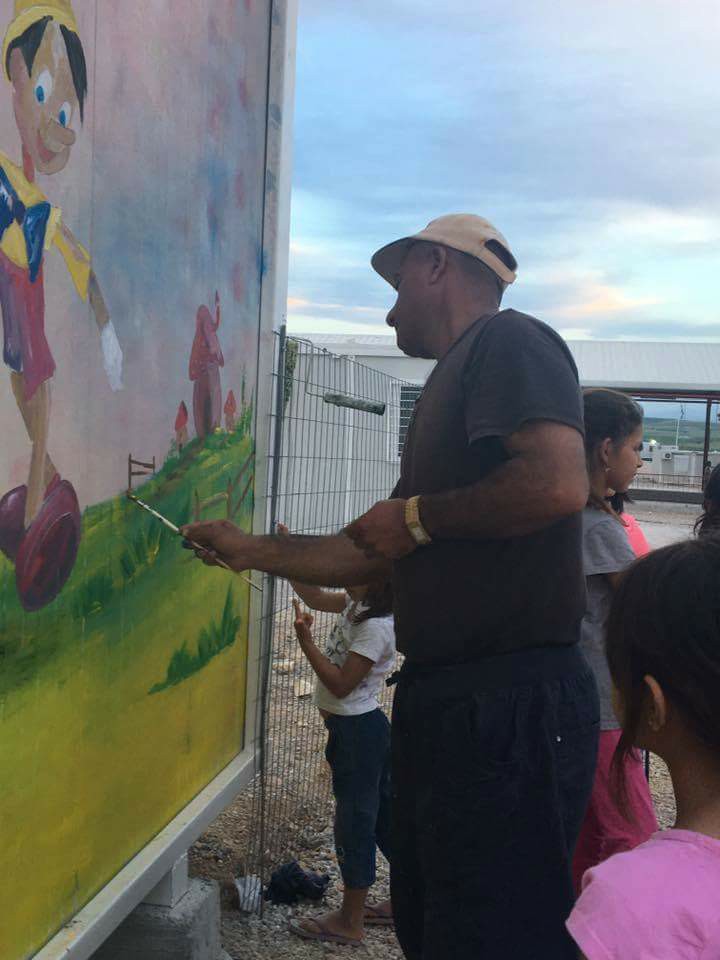 يقول "أبو نمير": "ساهمت بلدية مدينة لاريسا اليونانية؛ وفاعلو الخير، قدر المستطاع، لتأمين بعض الألوان ومعدات الرسم لتغيير الواقع ولو بشكل بسيط، عبر الرسم على الجدران".