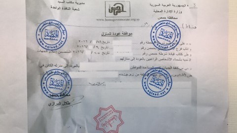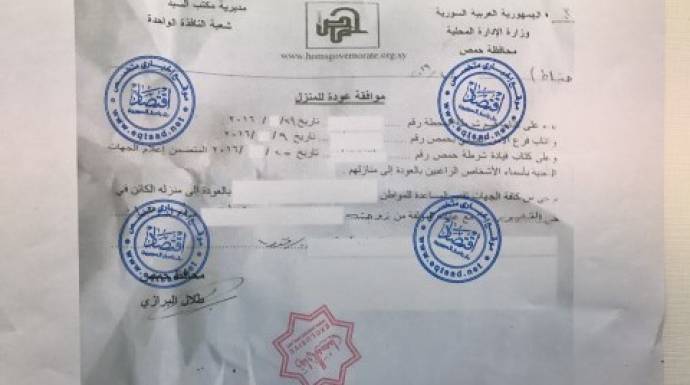 وتوضح الوثيقة أسماء العائدين للمنزل برفقة مالكه. وقد ختمت بتوقيع وختم محافظ حمص، طلال البرازي.