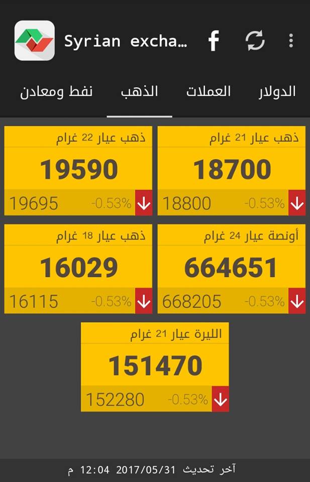 وفيما يلي أسعار أوزان الذهب حسب "سيرياستوكس"، ووفق التسعيرة الرسمية الصادرة عن جمعية الصاغة بدمشق: