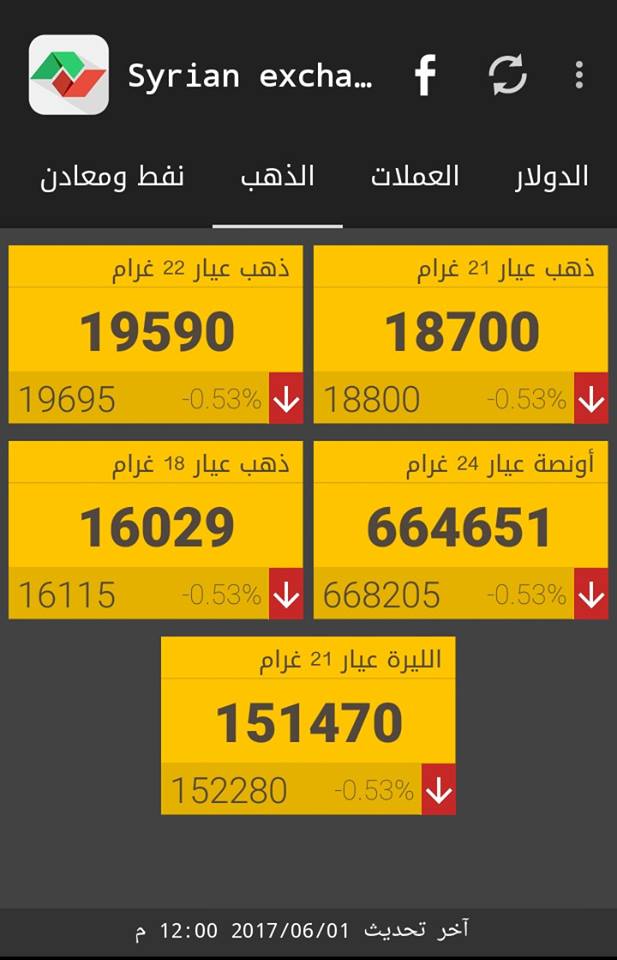 وفيما يلي أسعار أوزان الذهب حسب "سيرياستوكس"، ووفق التسعيرة الرسمية الصادرة عن جمعية الصاغة بدمشق: