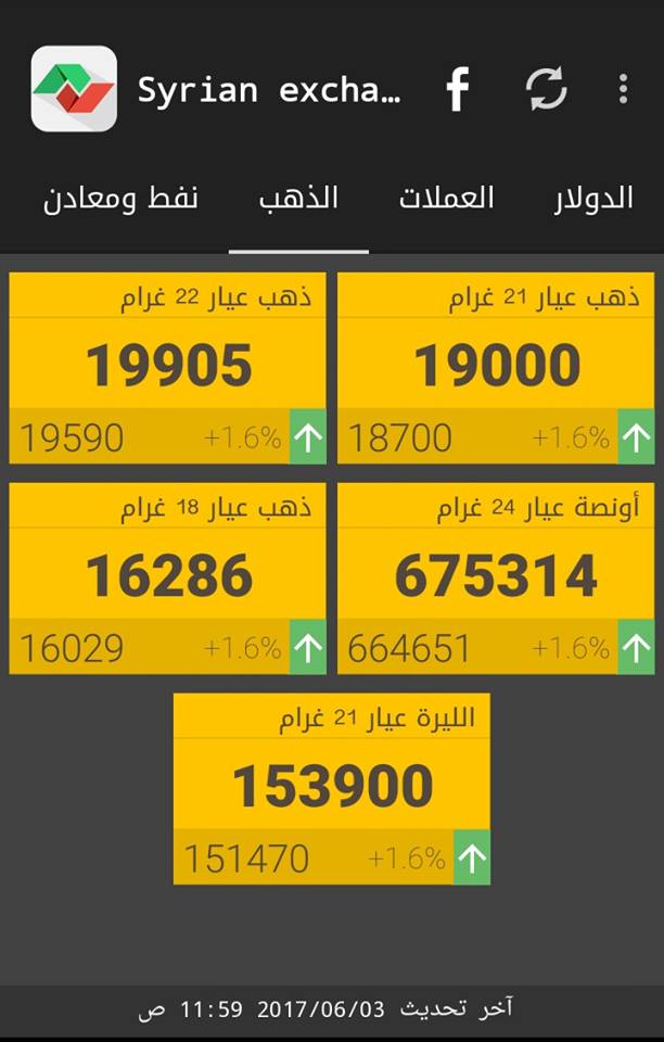 وفيما يلي أسعار أوزان الذهب حسب "سيرياستوكس"، ووفق التسعيرة الرسمية الصادرة عن جمعية الصاغة بدمشق: