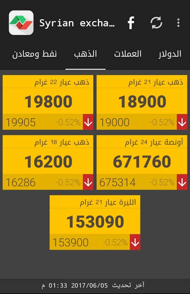 وفيما يلي أسعار أوزان الذهب حسب "سيرياستوكس"، ووفق التسعيرة الرسمية الصادرة عن جمعية الصاغة بدمشق:
