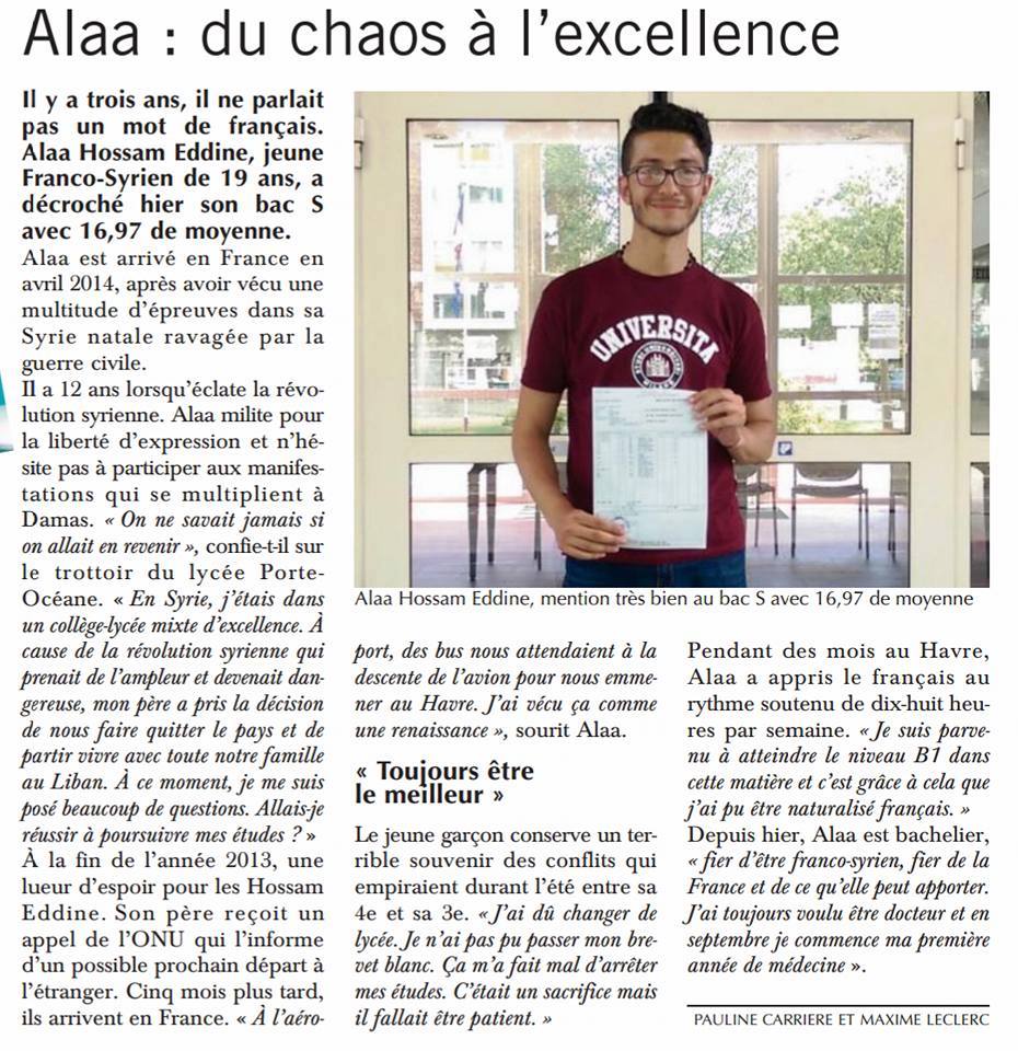 استطاع الطالب السوري، علاء حسام الدين، أن يحصل على معدل 16.97 من عشرين، في البكالوريا الفرنسية، وهو معدل جيد جداً، جعل الصحافة الفرنسية تتحدث عن تجربته وتفوقه، على الرغم من أنه قدم مع أسرته إلى فرنسا في العام 2014.