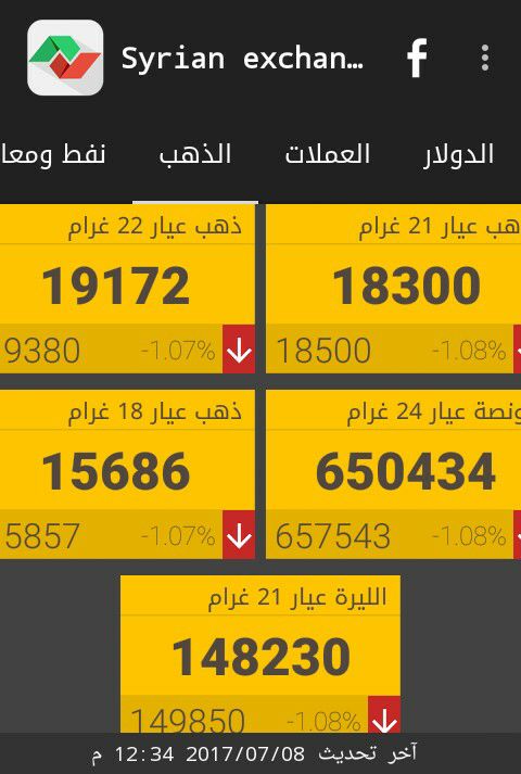 وفيما يلي أسعار أوزان الذهب حسب "سيرياستوكس"، ووفق التسعيرة الرسمية الصادرة عن جمعية الصاغة بدمشق: