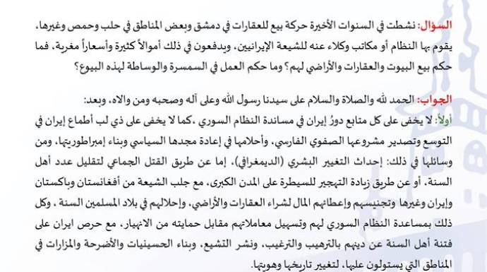 من جانبه أشار عضو أمناء المجلس الإسلامي السوري، مطيع البطين، إلى أن الفتوى جاءت بعد تأكد المجلس من وجود صفقات عقارية كبيرة تتورط بها جهات تابعة لإيران، ما أدى إلى قناعة لدى المجلس، بأن ما يجري ليس أمراً اعتباطياً وإنما ضمن مخطط ممنهج، بغية تثبيت دور إيراني فاعل في مستقبل البلاد.