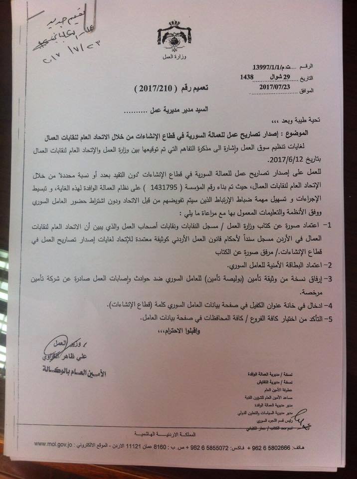 وقد نوهت أن منح تصاريح عمل للعمال السوريين اللاجئين لن يؤثر على فرص عمل الأردنيين، بل إنه سيجعل الفرص متساوية في قطاع الإنشاءات، بعد أن أصبح العامل السوري يتمتع بوضع قانوني، من خلال حصوله على تصريح عمل، ما يضع حداً لاستغلاله من قِبل صاحب العمل، وتشغيله بأجر أقل من الأجر العادي.