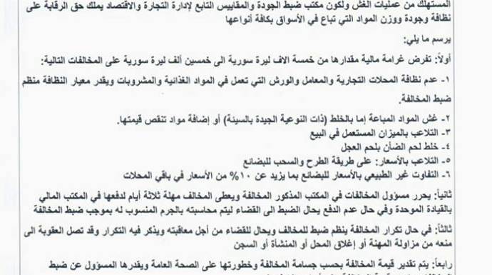 فرض غرامة مالية تتراوح بين خمسة آلاف إلى خمسين ألف ليرة سورية لكل مخالفة تتعلق بعدم النظافة الخاصة بالمحال التجارية وغش المواد المباعة والتلاعب بالميزان بالإضافة إلى التفاوت غير الطبيعي لأسعار البضائع بما يزيد عن 10 % من أسعار باقي المحلات".