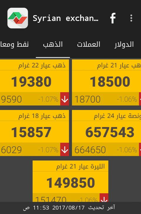 وفيما يلي أسعار أوزان الذهب في دمشق، حسب "سيرياستوكس"، ووفق التسعيرة الصادرة عن جمعية الصاغة: