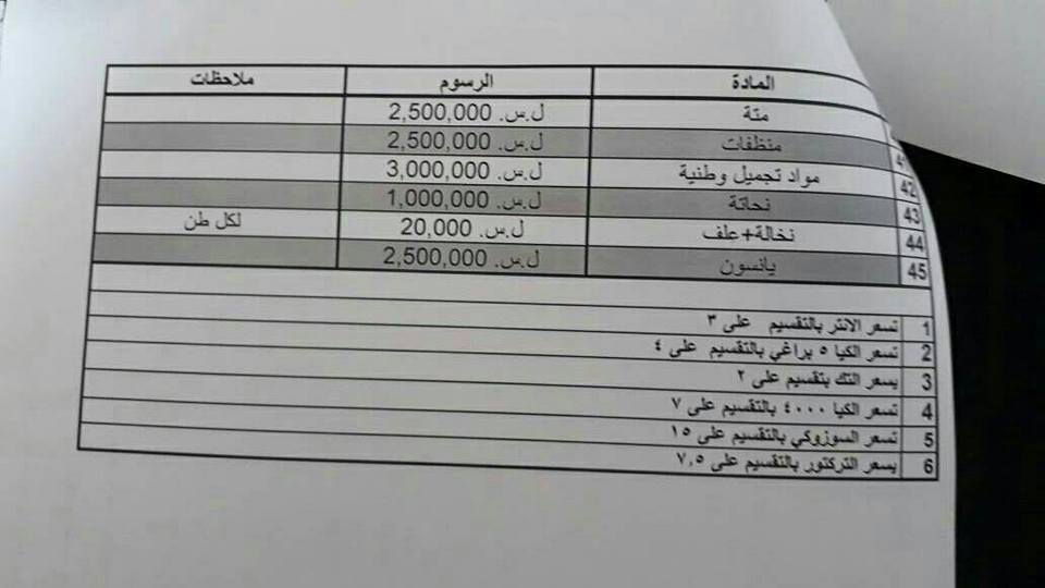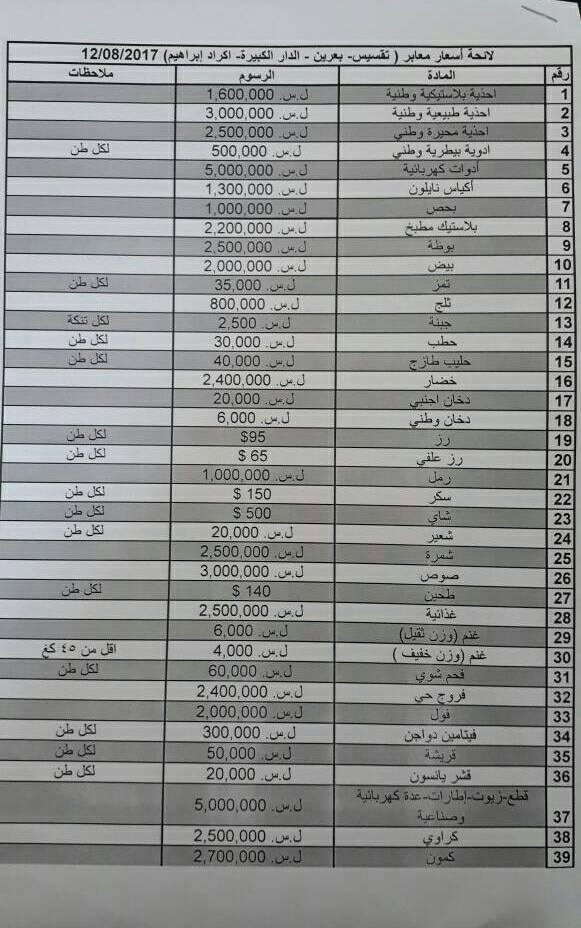 في تطوّر يتزامن مع توقيع اتفاقية تخفيف تصعيد جديدة، خلال الأسبوع القادم، في ريفي حمص الشمالي وحماة الجنوبي، بدلاً من الإتفاق الذي وقع في القاهرة مؤخراً، أصدرت ميليشيات موالية للنظام، قبل أيام، لائحة أسعار، حصل موقع "اقتصاد" على صورة منها، تتضمن مقدار الرسوم بشكل مفصل، مقابل إدخال كل مادة عبر معابر "الدار الكبيرة، تقسيس، أكراد إبراهيم، وبعرين"، وهي المعابر التي تربط ريف حمص الشمالي، وبعض القرى المحررة بريف حماة الجنوبي، بمحافظتي حمص وحماة.