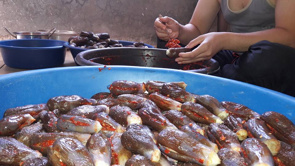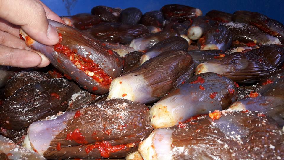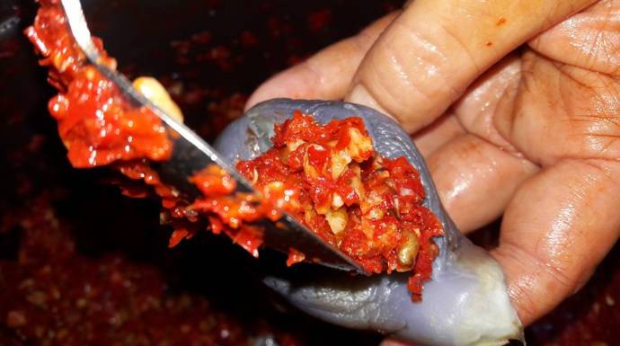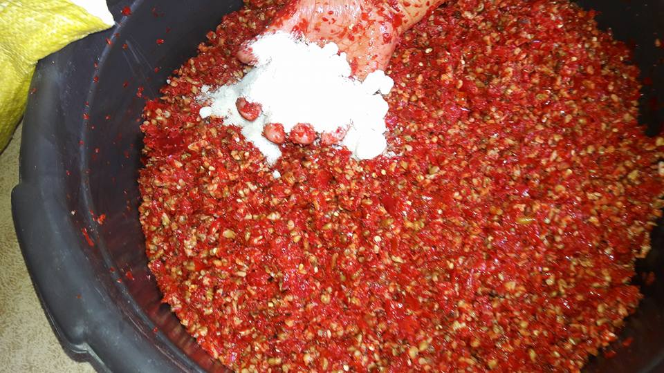 كان كفا السيدة "أم أحمد" مليئين بالفليفلة الحمراء الحارة نسبياً، وهي تملأ قطع الباذنجان المسلوق بالحشوة المكونة من الثوم والفليفلة والجوز وملح الطعام.