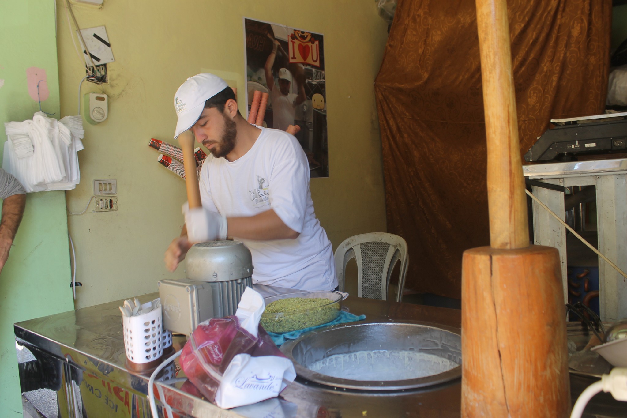 في وسط مدينة إدلب؛ وبالقرب من منطقة دوار الساعة تحديداً، كان السيد "أكرم جباس" منهكاً بطرق مزيج من الحليب والسحلب بمطرقة خشبية كبيرة؛ ومن ثم تحويله إلى لفافة مزينة بالفستق الحلبي ذات منظر جميل وطعم رائع.