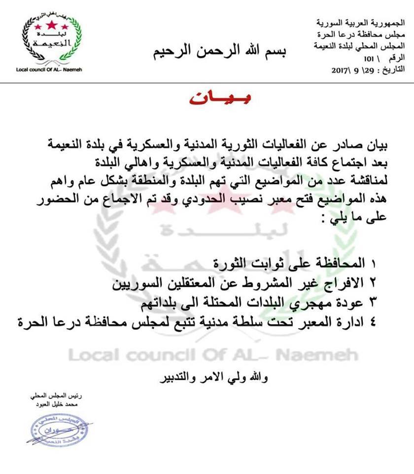 وقد حصل "اقتصاد" على نسخة من بيان صادر عن الفعاليات الثورية المدينة والعسكرية في بلدة النعيمة، يفيد بأن اجتماعاً ضم كافة الفعاليات في البلدة، خلص إلى مجمل قرارات تخص موضوع فتح معبر نصيب الحدودي مع الأردن، أبرزها، المحافظة على ثوابت الثورة، والإفراج غير المشروط عن المعتقلين السوريين، وعودة مهجري البلدات المحتلة إلى بلداتهم، وإدارة المعبر تحت سلطة مدنية تتبع لمجلس محافظة درعا الحرة.