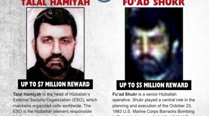 وقالت وزارة الخارجية الأمريكية إن واشنطن تعرض ما يصل إلى سبعة ملايين دولار لمن يدلي بمعلومات تفضي إلى اعتقال طلال حمية قائد وحدة العمليات الخارجية لحزب الله وما يصل إلى خمسة ملايين دولار لمعلومات عن فؤاد شكر وهو أحد أبرز العناصر العسكرية في حزب الله.