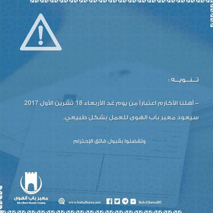 أعلنت إدارة معبر باب الهوى الحدودي مع تركيا، في محافظة إدلب، أن المعبر سيعود للعمل بشكل طبيعي ابتداءً من اليوم الأربعاء 18 تشرين الأول/أكتوبر 2017.