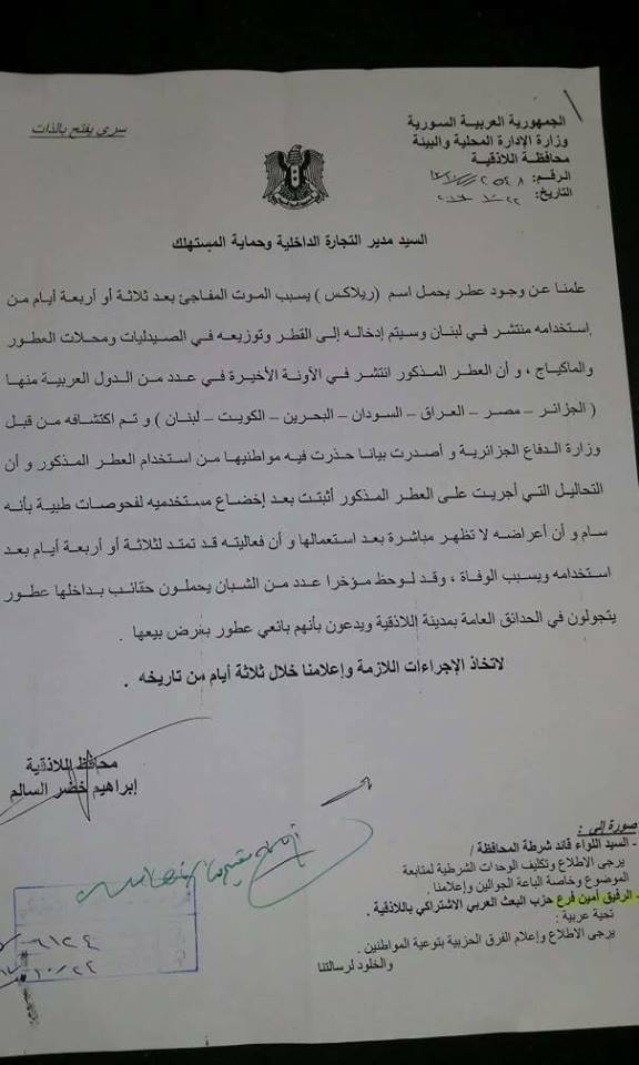 غير أن أجهزة النظام لم تستنفر إلا عندما وصلتها معلومات عن وجود أشخاص يحملون حقائب ويبيعون العطور في الحدائق والأماكن العامة في محافظتي اللاذقية وطرطوس، وبأن هناك شكوكاً بأن العطور التي يبيعونها مثيرة للشبهة كونها جيدة النوعية ورخيصة، وهو ما أدى لاستنفار الجهات المختصة في المحافظتين، حيث عمدت إلى تسيير دوريات في الشوارع وعلى محال العطور، لكنها حتى الآن لم تعثر على ما يشير إلى وجود مثل هذا العطر السام.