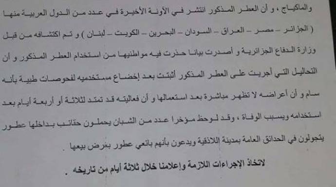 بدأت القصة عندما أعنت وزارة الدفاع الجزائرية قبل نحو شهرين، أنها اكتشفت في الأسواق عطراً ساماً يؤدي إلى وفاة مستخدمه بعد عدة أيام، ثم أعلنت عدد من الدول العربية اكتشافها نفس العطر في أسواقها، ومنها مصر والعراق والسودان والكويت والبحرين ولبنان، وسرت شائعات بأن العطر وصل إلى سوريا عبر تهريبه من لبنان.