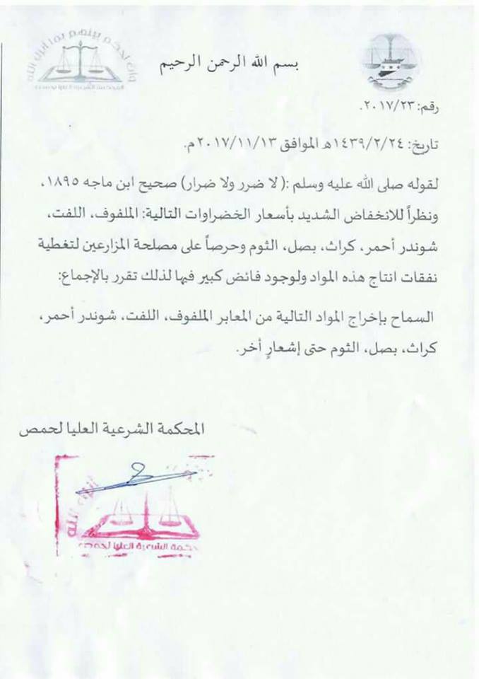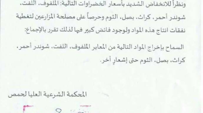 أصدرت المحكمة العليا في ريف حمص، قراراً يسمح لتجار الريف بإخراج الملفوف واللفت والشمندر الأحمر والكراث والبصل والثوم، للتصدير خارج الريف المحاصر، حتى إشعار آخر.