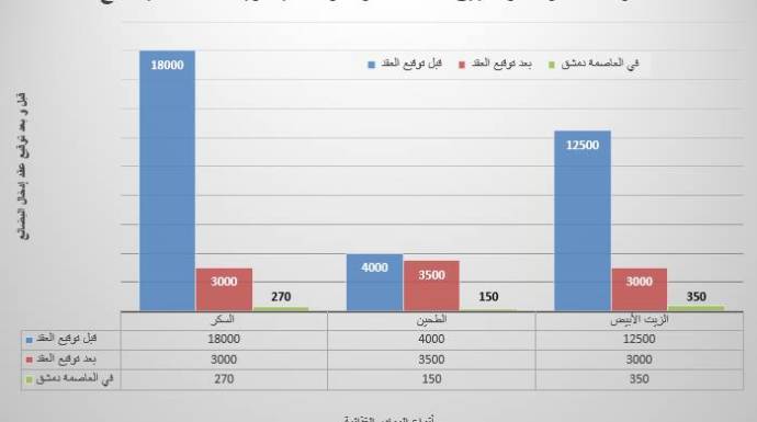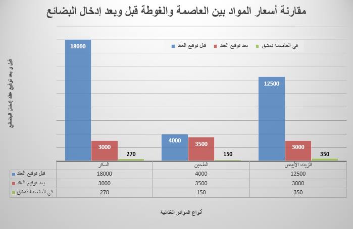 بعد وصول قوافل أحد التجار إلى الغوطة عبر معبرها الوحيد، بدأت أسعار المواد الغذائية في أسواق الغوطة انخفاضاً ملحوظاً، حيث كان النصيب الأكبر من هذا الإنخفاض لمادتي السكر والزيت، وذلك بعد أن وصلت سعر عبوة الزيت الواحدة قبل أيام قليلة إلى 14 ألف ليرة سورية، وكيلو السكر الواحد إلى 18 ألف ليرة سورية، فضلاً عن ارتفاع مادة الملح ليصل سعر الكيلو الواحد إلى 10 آلاف ليرة سورية.