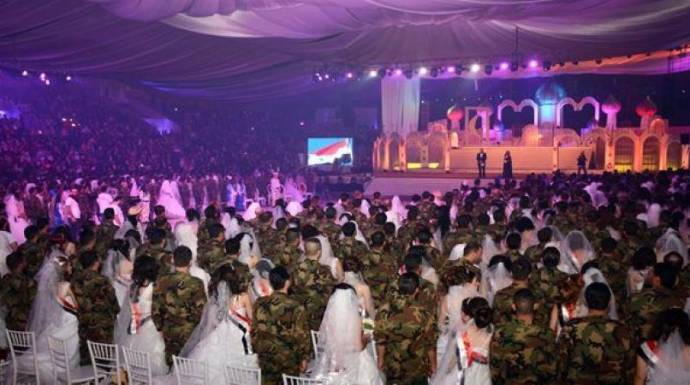 ووصفت وسائل إعلام النظام الحفل بأنه الأضخم من بين خمسة أعراس جماعية كان قد أقامها رامي مخلوف منذ العام 2014 وزوج خلالها أكثر من 1400 عسكري وعنصر مخابرات من أبناء المنطقة الساحلية.