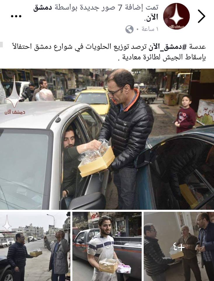 رافق مشهد إسقاط الطائرة الإسرائيلية من قبل دفاعات النظام الجوية، حفلة فرح عارمة في وسائل إعلام النظام، انتقل بها إلى الشوارع والحواجز الأمنية، إذ تداول صوراً لجنوده وهم يوزعون الحلويات على الناس بدل اعتقالهم.