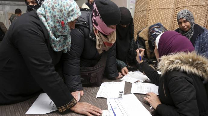 داخل المكتب، احتشد اللاجئون حول مائدة طويلة يجلس إليها أصحاب مصانع ومزارع، ولوحوا ببطاقات هوياتهم للتسجيل.