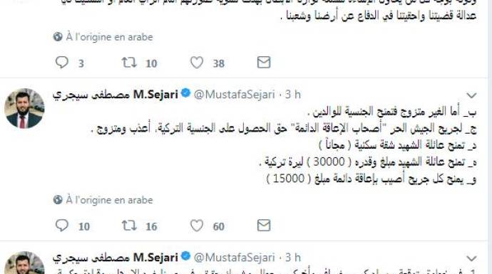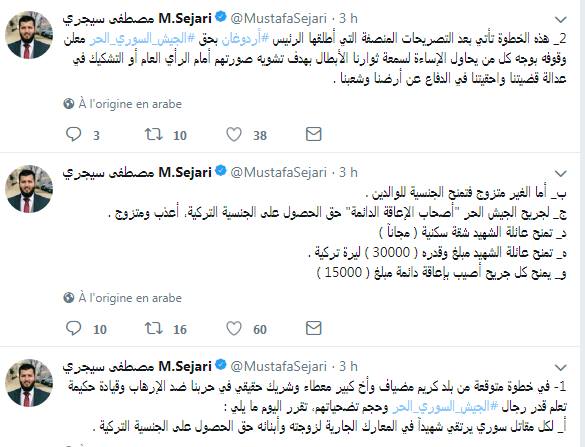 نشر "مصطفى سيجري"، على حسابه في "تويتر"، معلومات تفيد بأن الحكومة التركية بصدد منح جنسية بلادها لعائلات الجنود الذين قد يسقطون قتلى في معارك "غصن الزيتون" الدائرة حالياً، في عفرين، شمال غرب سوريا.