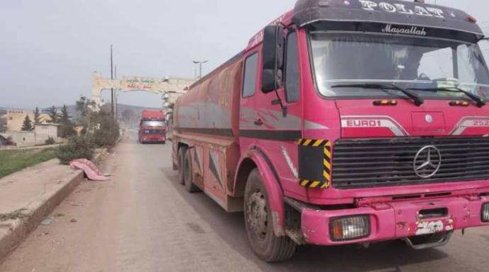 يجلس "صفوان سيد يوسف" على شرفة منزله في منطقة قاح بريف إدلب، حيث يتمكن من متابعة الصهاريج المحملة بالوقود القادمة عبر طريق عفرين.