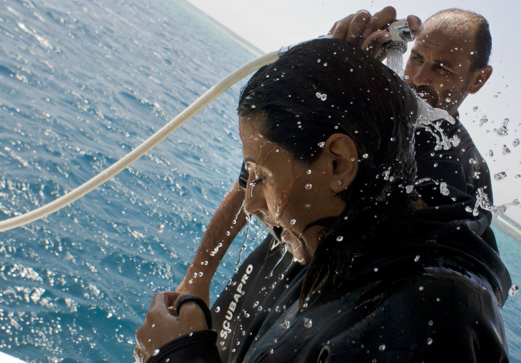 في المياه تضع غطاء رأس، لكن على متن القارب- وهي الغواصة الوحيدة بين مجموعة رجال- تظل حاسرة الرأس.