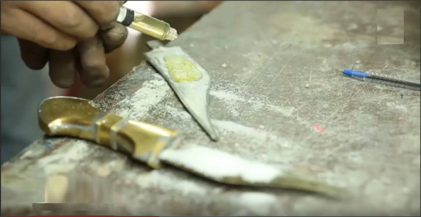 وبعد هذه المرحلة يبدأ عبارة –كما يقول- بتنعيم السطح الخشبي بالمبرد حتى يصبح أملساً، وتصبح قطعتا الخشب متقنتين تماماً– ويفصلهما ثم يجوف كلاً منهما تجويفاً على شكل شفرة الخنجر مستخدماً في ذلك المطرقة والأجنحة، ثم يلصقهما معاً مرة أخرى.. ويقوم بعدها بإدخال طرف الشفرة في الفتحة المعدة لها في المقبض ثم يثبتها بالمسامير المعدنية كي لا تتحرك، ويكون غمد الخنجر جاهزاً وهو ما يُسمى (قراب الخنجر) ثم يقوم بلحم القراب من الجانبين بالقصدير، وعندما يتم تنكيله يختفي أثر اللحام ويصبح شكل الخنجر انسيابياً لا نتوء فيه وبذلك يكتمل شكل الخنجر.