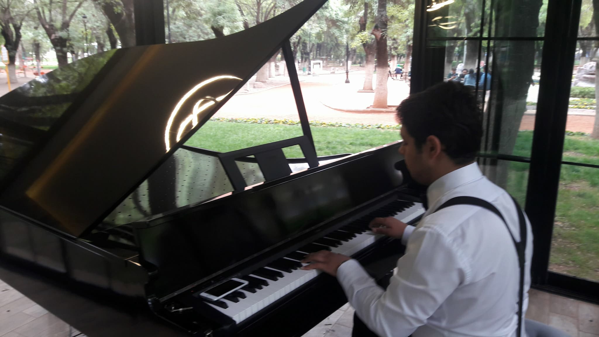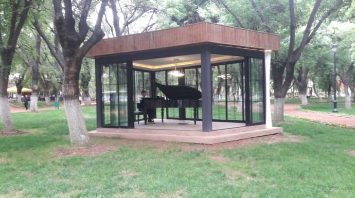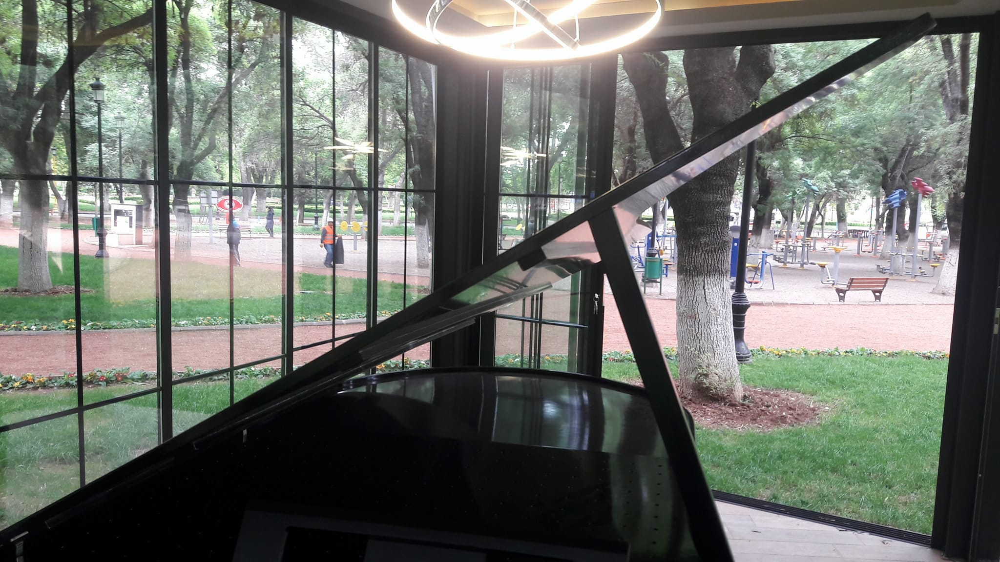 "نستمع بهدوء وسكينة للعزف الذي يصدر من غرفة الموسيقا المخصصة لذلك، ونراقب العازف مع آلته وألحانه، يمكن لكل من يجلس في الحديقة الاستماع إليها لوجود ميكروفونات صغيرة موزعة فيها".