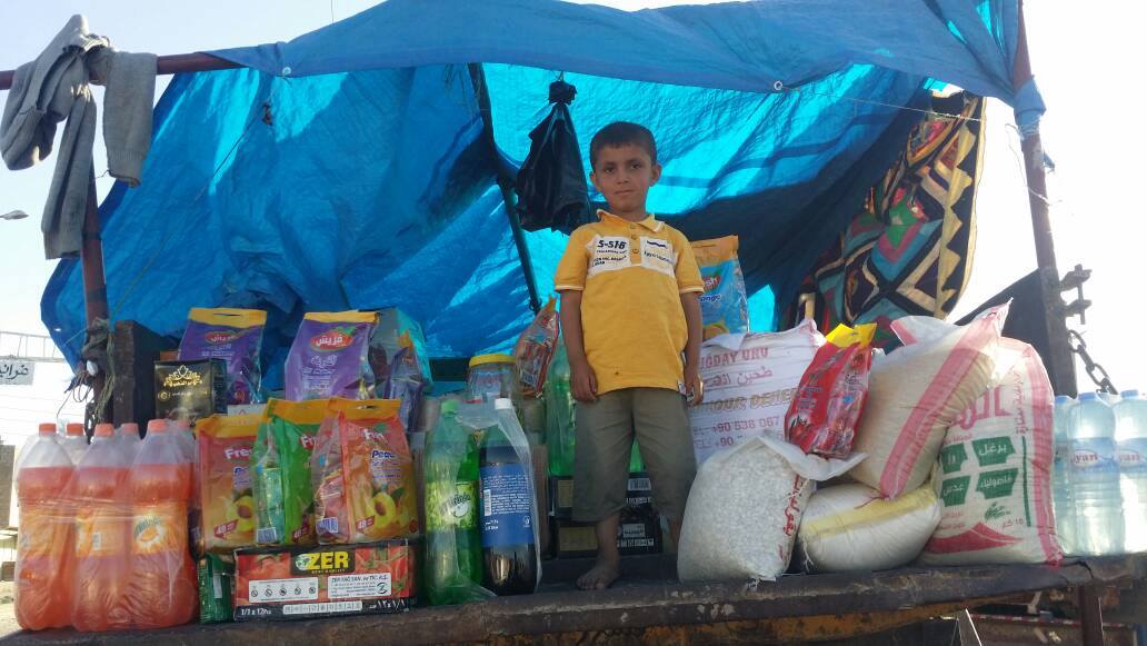 تحول "أبو خالد" مع طفله الصغير من أعمال الفلاحة بالأوضاع العادية إلى بيع المواد الغذائية والمشروبات الغازية على بسطة في "سوق غرانيج" بسبب ظروف الحرب وحالة النزوح التي يعيشها مع عائلته المؤلفة من 12 فرداً فلديه 6 أطفال ذكور و4 إناث من زوجتيه.
