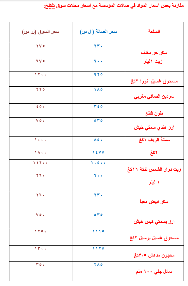 مقارنة بعض أسعار المواد في صالات المؤسسة مع أسعار محلات سوق تلكلخ: