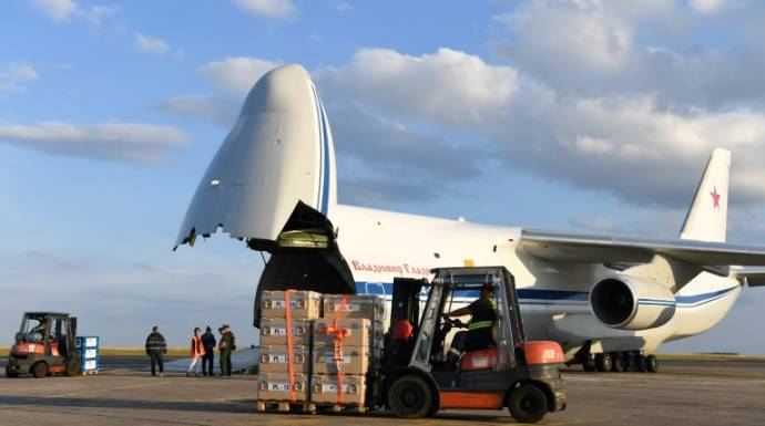 وهبطت طائرة شحن روسية ضخمة من طراز "انطونوف 124" تابعة للجيش الروسي وتقل 50 طنا من المواد الطبية واخرى اساسية قدمتها فرنسا في قاعدة حميميم في غرب سوريا آتية من مطار شاتورو (وسط فرنسا)، بحسب ما أعلنت وزارة الدفاع الروسية في بيان.