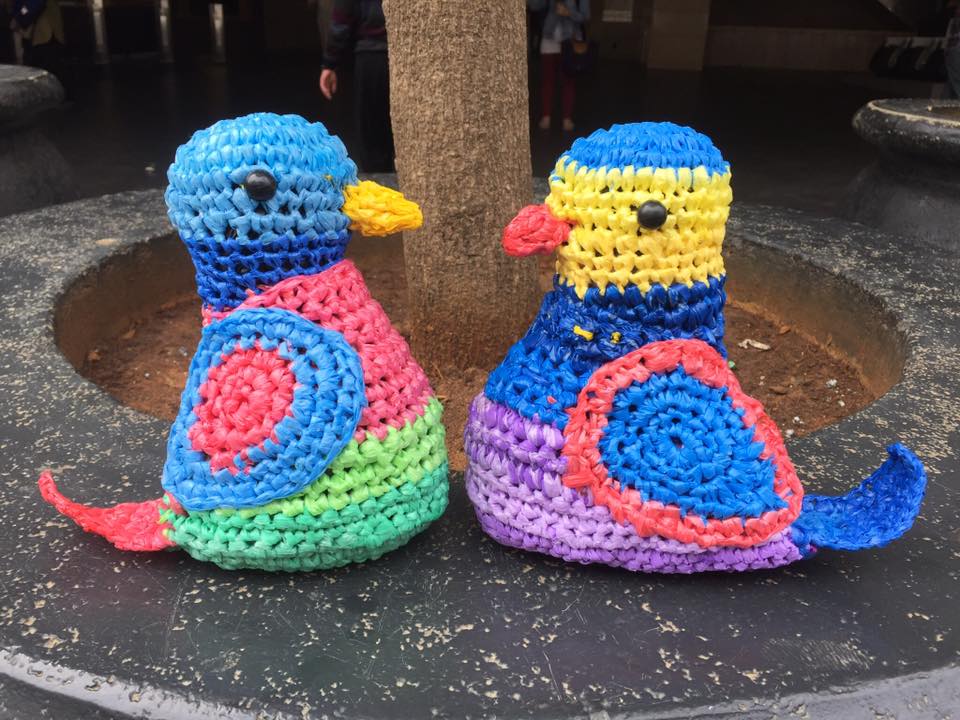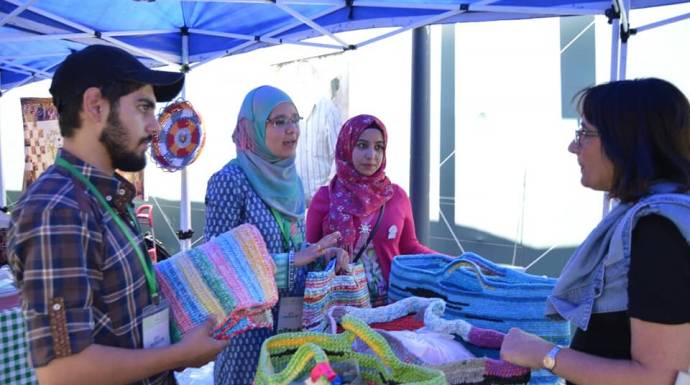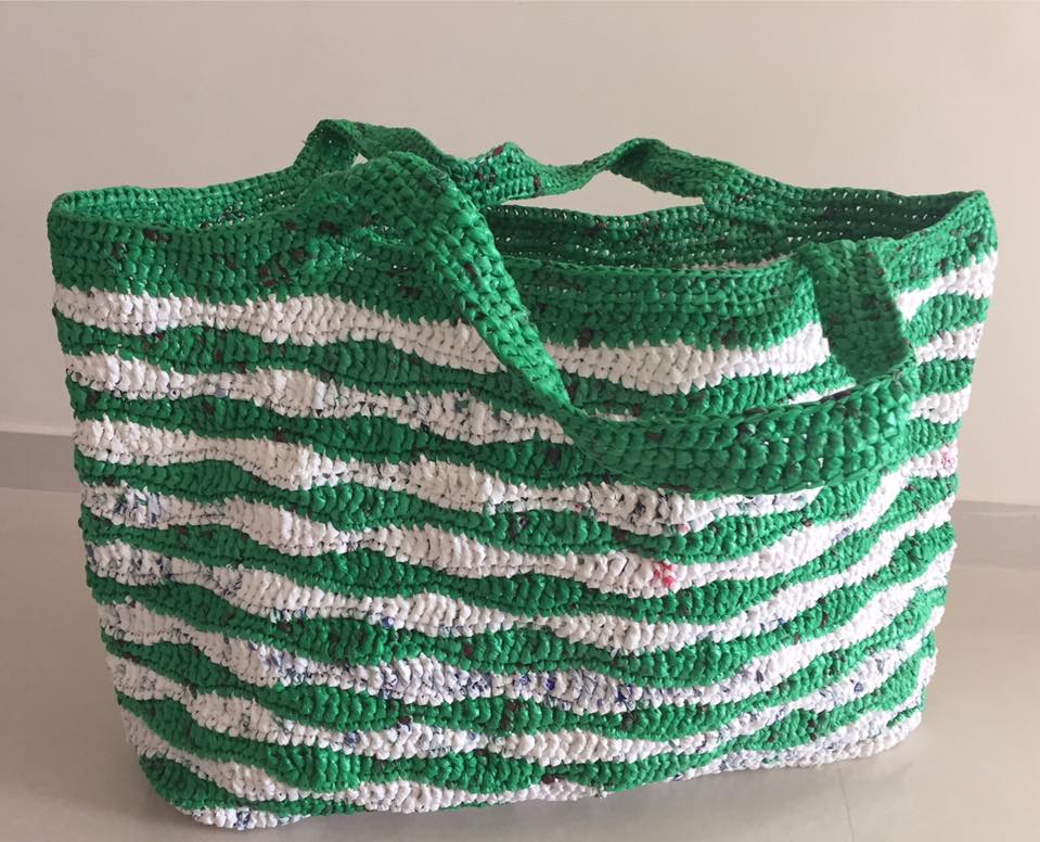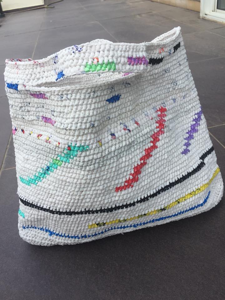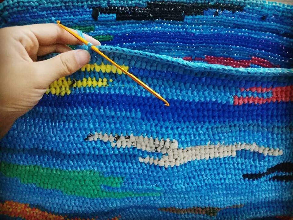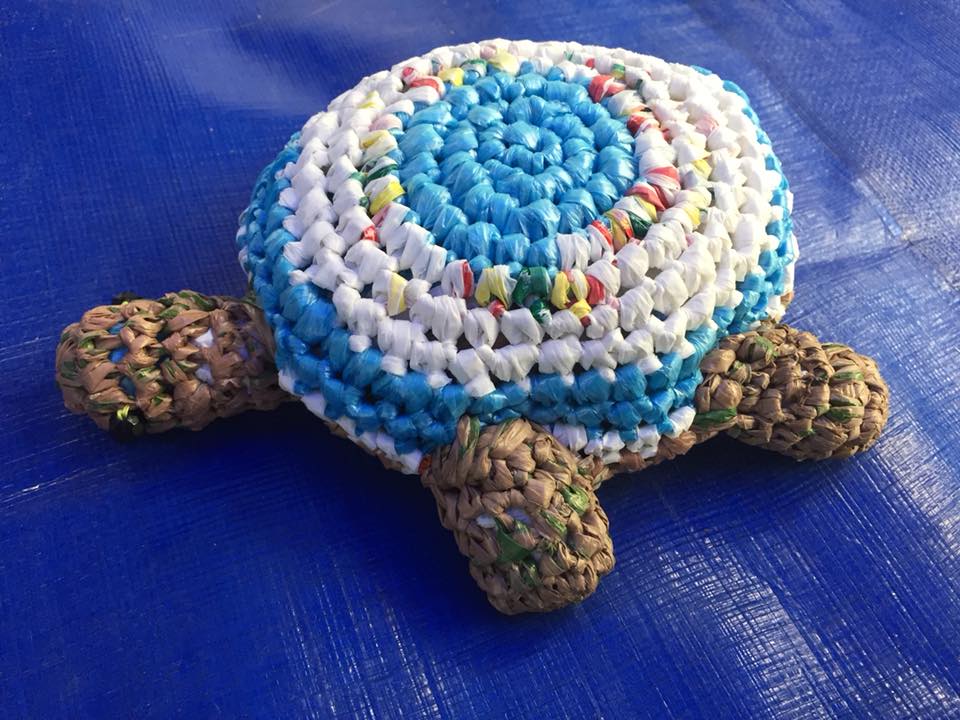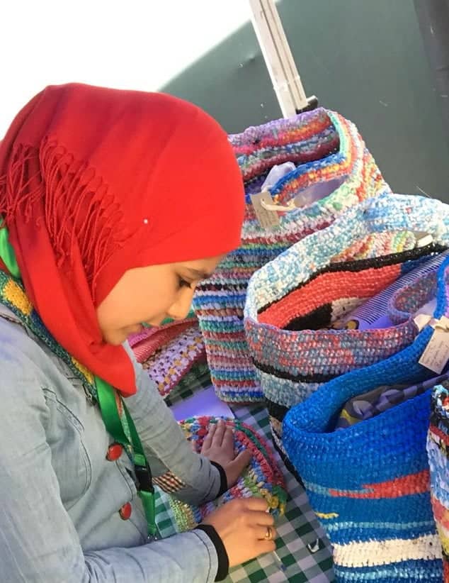 بصنارة معدنية صغيرة وخيطان مأخوذة من أكياس النايلون المهملة تُحيك الشابة اللاجئة "آلاء الزهوري" مع عدد من السوريات اللاجئات حقائب ملونة من مختلف الأشكال والألوان والأحجام ومجسمات طريفة لحيوانات برية وبحرية ضمن مشروع أطلقن عليه اسم جيلي فيش jellyfish بهدف حماية الطبيعة والبيئة البحرية ومنها السلاحف من خطر الأكياس البلاستيكية وتأمين مدخول صغير لسيدات نازحات سوريات يعشن حالياً في لبنان.