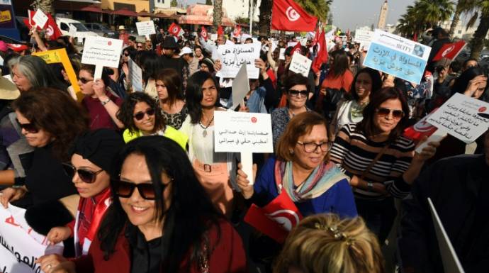 وأفادت مراسلة وكالة فرانس برس أن المتظاهرين أطلقوا هتافات تدعو الى المساواة بين الجنسين، وأن عددا من المتظاهرات رفعن الأعلام التونسية وأخريات التحفن بها.
