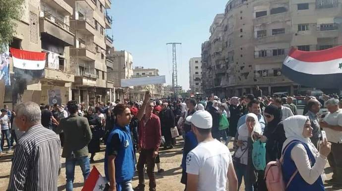 وتوافد الأهالي منذ العاشرة من صباح يوم الثلاثاء إلى دوار الزيتون وسط المدينة بصحبة محافظ ريف دمشق علاء إبراهيم، الذي ألقى خطبة وسط الجموع ثم سمح لهم بالتجول في مدينتهم لتفقد المنازل.